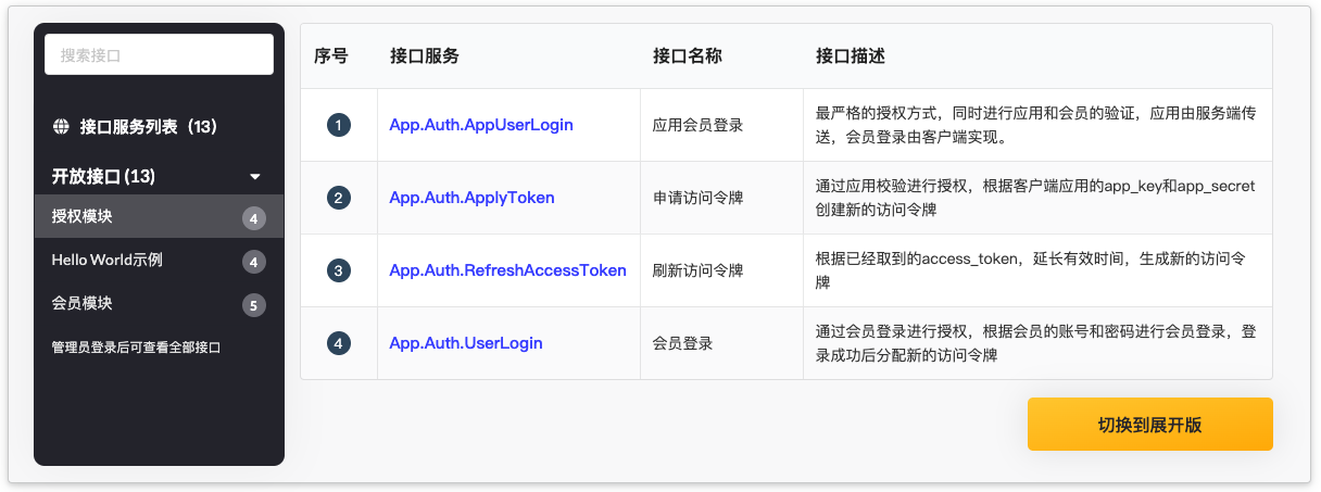 全部接口,可通过在线接口文档浏览。管理员登录后可查看全部内部接口。