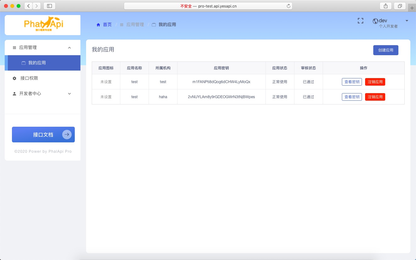 提供给平台的开发者使用,可进行应用管理、查看接口权限等操作。基于iView Admin开发,采用前后端分离技术方案。