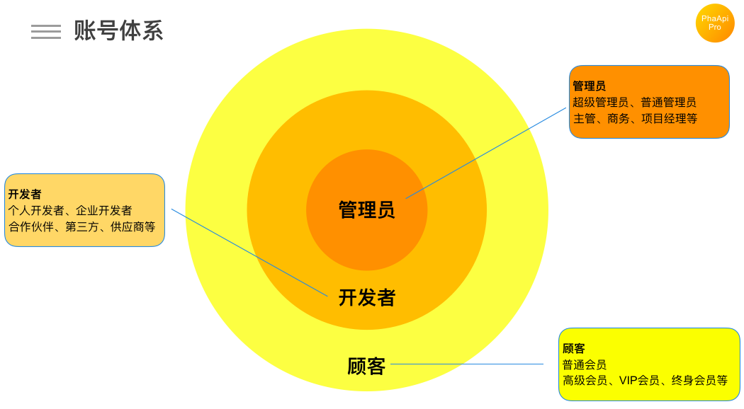 PhalApi Pro 提供了全面的账号体系,以满足企业、开发者和最终顾客不同层级的账号需求。
