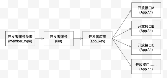 从开发者账号类型为起点开发者账号类型分为个人开发者、企业开发者等多种开发者类型每种开发者账号类型下可注册多个开发者而每个开发者可以创建多个应用每个应用可以调用多个开放接口API。因此整体的结构如下