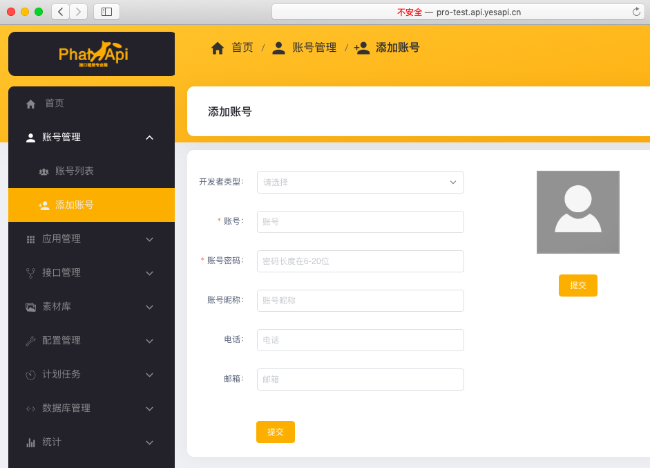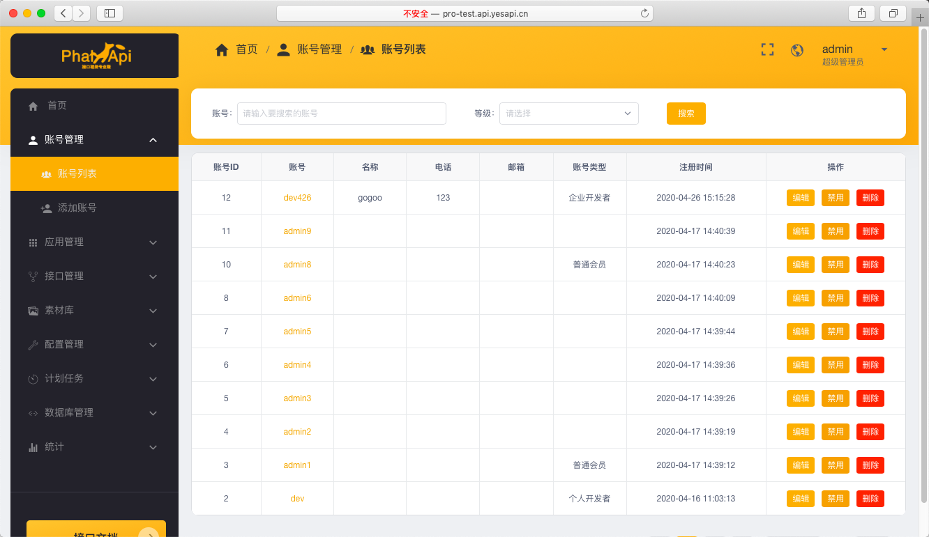 管理和查看全部账号,包括管理员、开发者和会员的账号,进行账号的管理,例如修改密码、修改资料、创建账号。