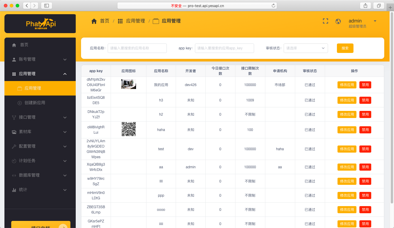 可以对客户端应用进行管理,如审核开发者应用、查看应用信息、限制应用接口调用次数、禁用或恢复等。