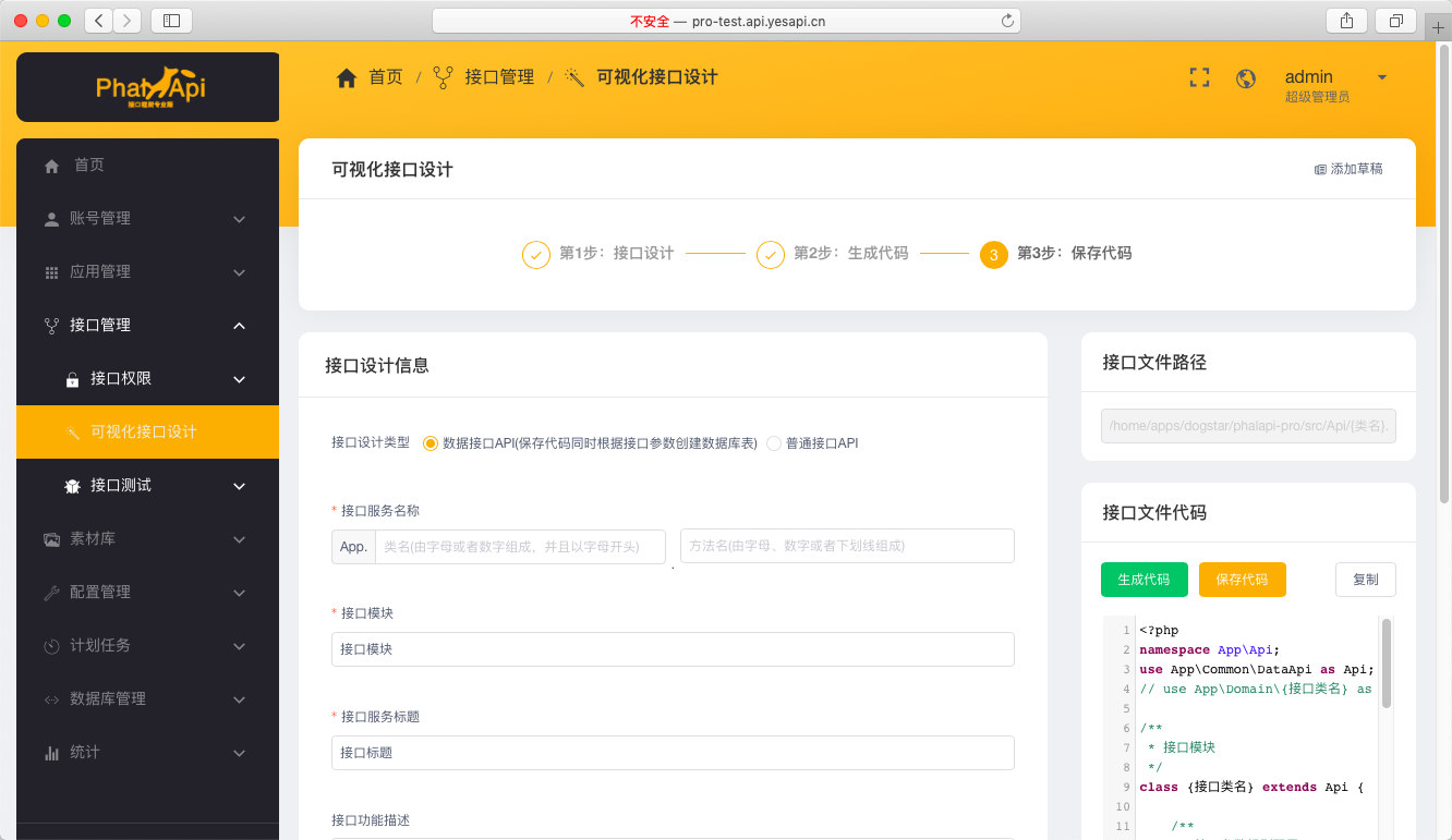 接口设计: 可以在线生成接口代码、保存接口代码还可以创建数据库表生成对应的CURD通用数据接口。