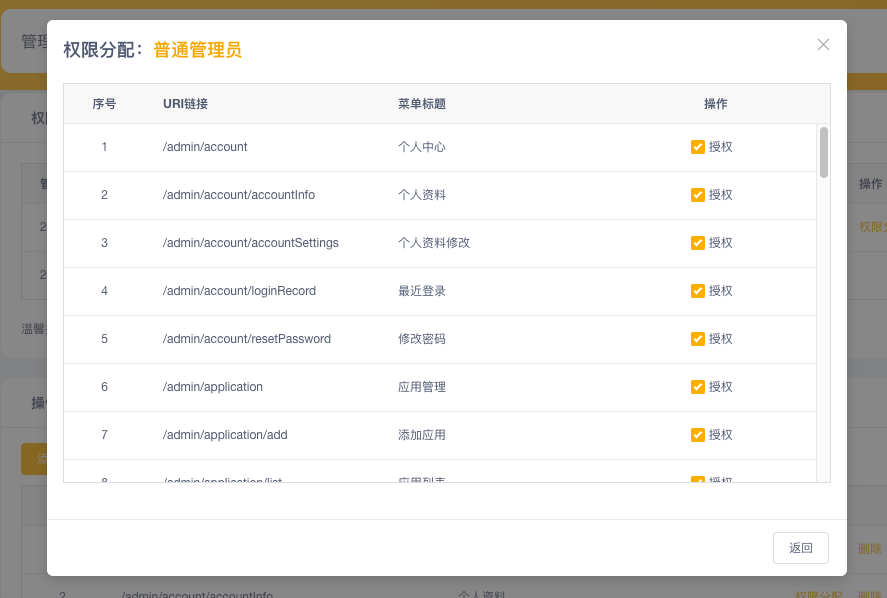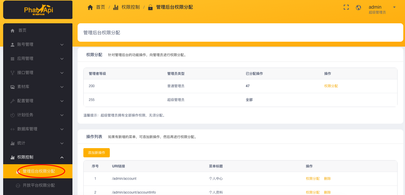 点击【权限】-【管理后台权限分配】,可针对管理后台的功能操作,向管理员进行权限分配。