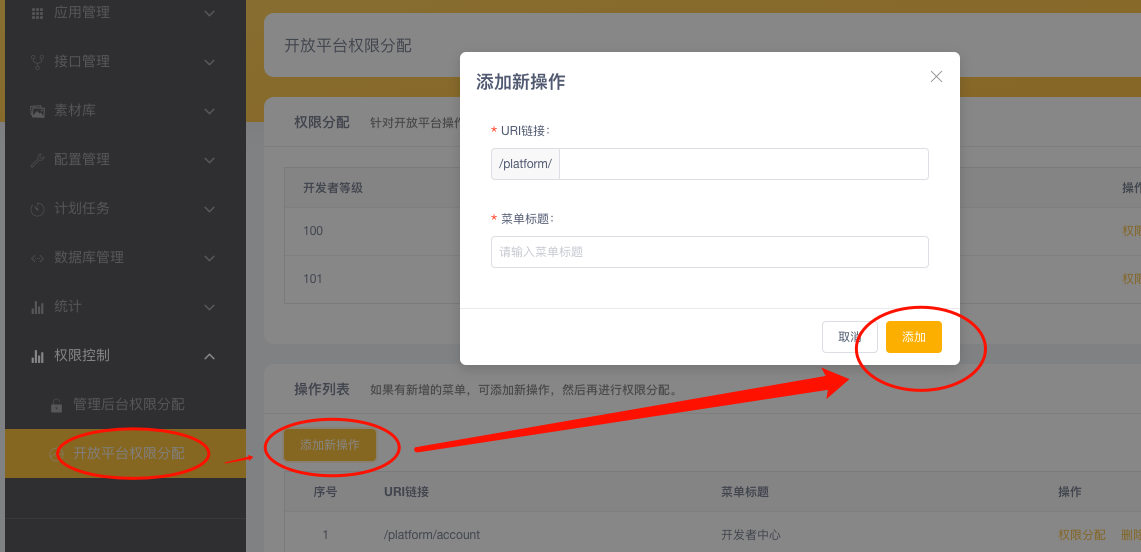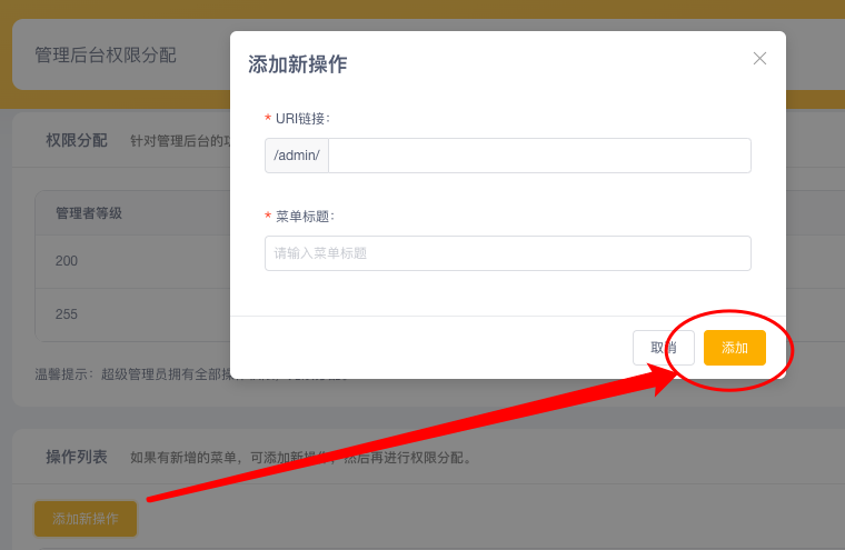 添加新操作,如果有新增的菜单,可添加新操作,然后再进行权限分配。