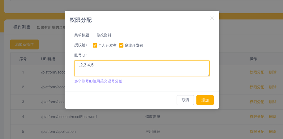 也可以针对个别开发者账号ID单独分配开放平台的操作权限。