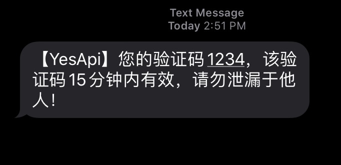 "Content": "【YesApi】您的验证码1234,该验证码15分钟内有效,请勿泄漏于他人!",