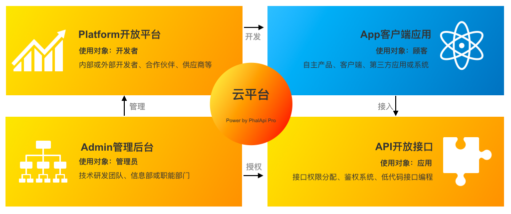 综上所述,Platform开放平台是提供给开发者使用的,API开放接口是提供给程序使用的。这两个子系统都是对外的,而Admin管理后台与此不同,Admin管理后台是对内的,是提供给内部管理员使用的,可以对开发者和API接口进行管理,以及其他管理操作,例如应用审核、权限分配等。