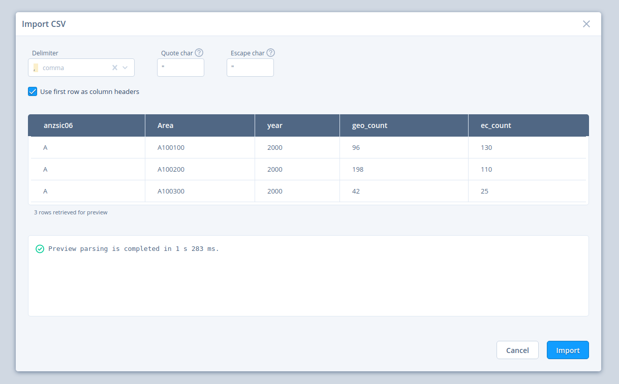If you choose a CSV file it will be parsed. Then sqliteviz creates a new database with data from CSV in csv_import table. You can change parse settings in the dialog which is shown automatically if you choose a CSV file (fig. 2).